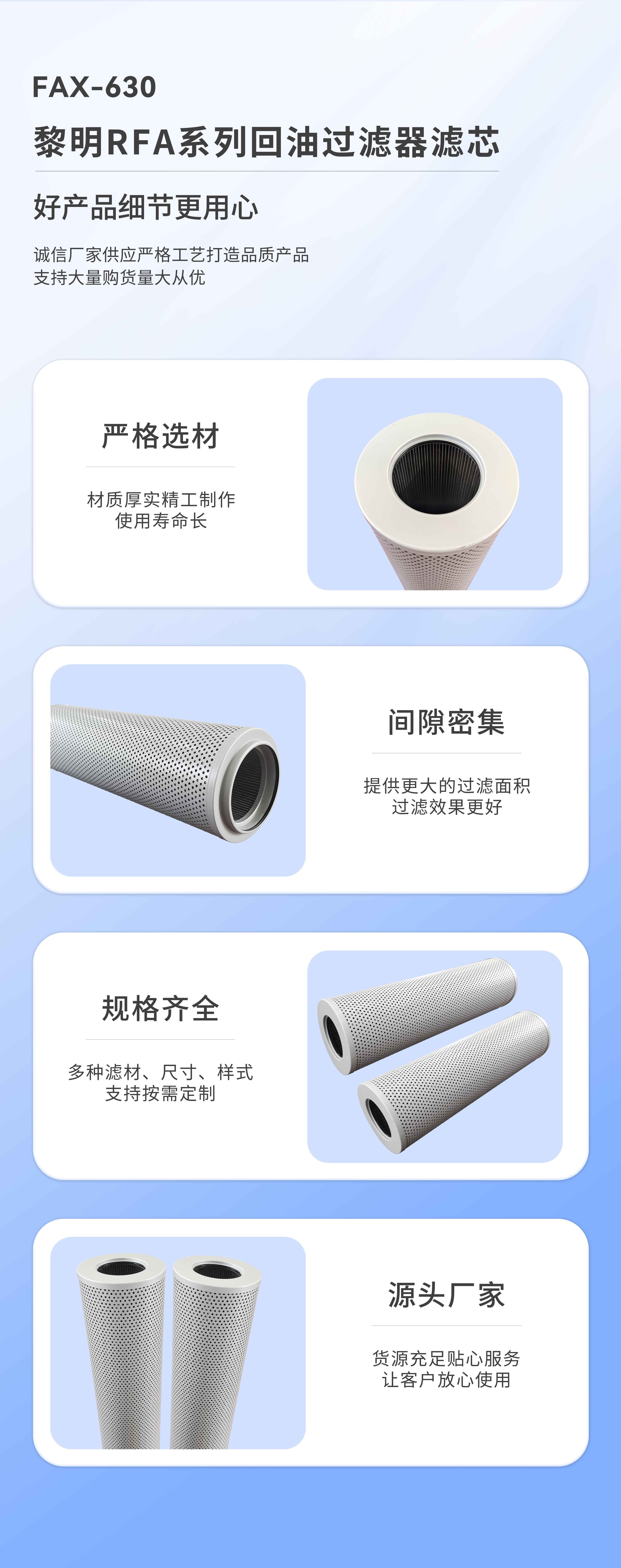 當液壓系統中的過濾液體由過濾器進口進入時,經濾芯自外向里透過濾層而被過濾成澄清液體,然后經管路出口排出,污染物雜質被截留在濾芯的深 層及表面,從而達到較高的過濾效率。濾芯精度的高低、結構尺寸的確定是由其過濾時的流量和過濾介質的特性所決定的。濾芯的濾材均為國產/進口玻纖或不銹鋼濾網組成,結構合理,波紋整列均勻,流量大,受阻力小。 黎明RFA直回式回油濾芯性能與特點: