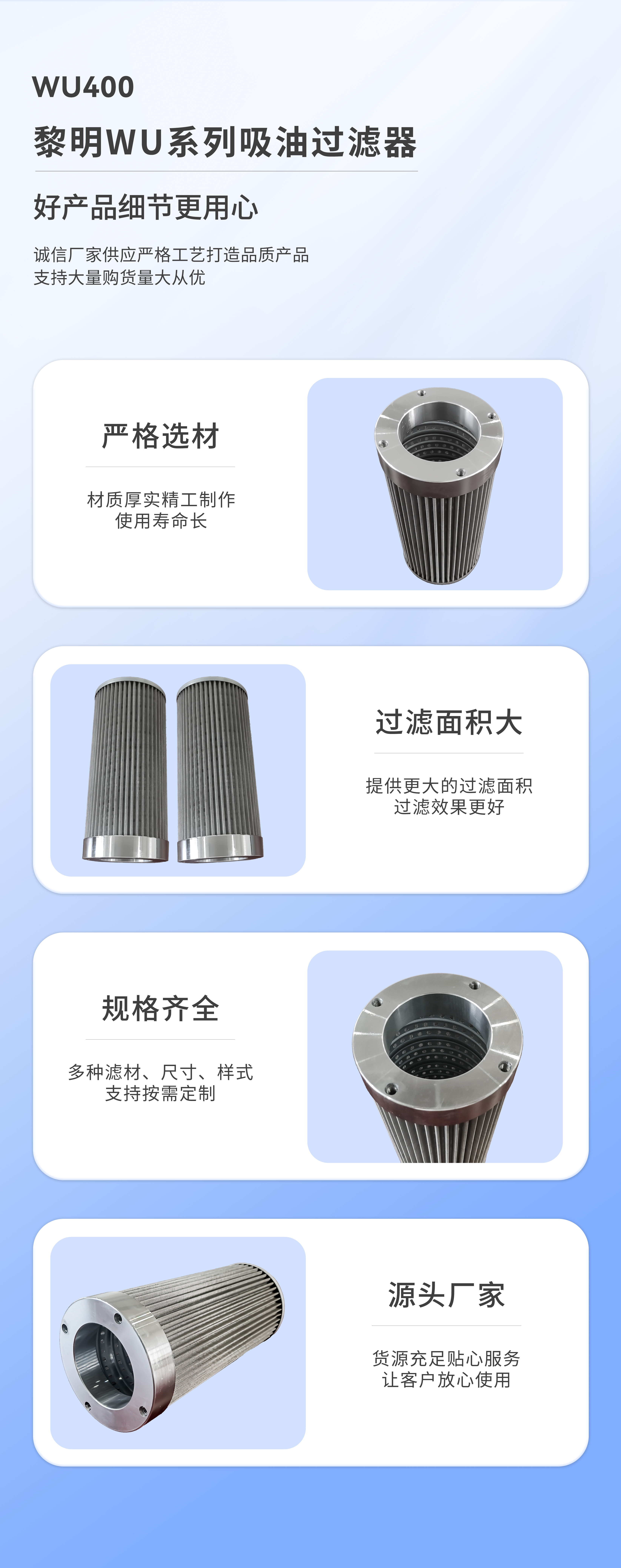 液壓濾芯作為液壓過濾器的核心部件,安裝在液壓過濾器殼體內執行著過濾功能,濾除工作介質中的顆粒物污染物,保護液壓元件的工作。 液壓濾芯由上、下端蓋,濾層(由過濾層、支撐層、均流層)以及骨架組成,濾層以圓柱體的形狀以圓柱體的形狀固定在內、外骨架之間,并在上、下端蓋處密封,應用時根據實際情況確定液體的流動方向(從濾芯外流向濾芯內部或從內部流向外部)。黎明WU系列吸油過濾器: 工業用液壓油在使用過程中由于種種原因會混進去一些雜質,主要的雜質有機械雜質,水和空氣等,這些雜志會造成腐蝕加快,增加機械磨損,降低工作效率,使油品變壞降低設備使用壽命,嚴重時會產生油路堵塞造成生產事故。