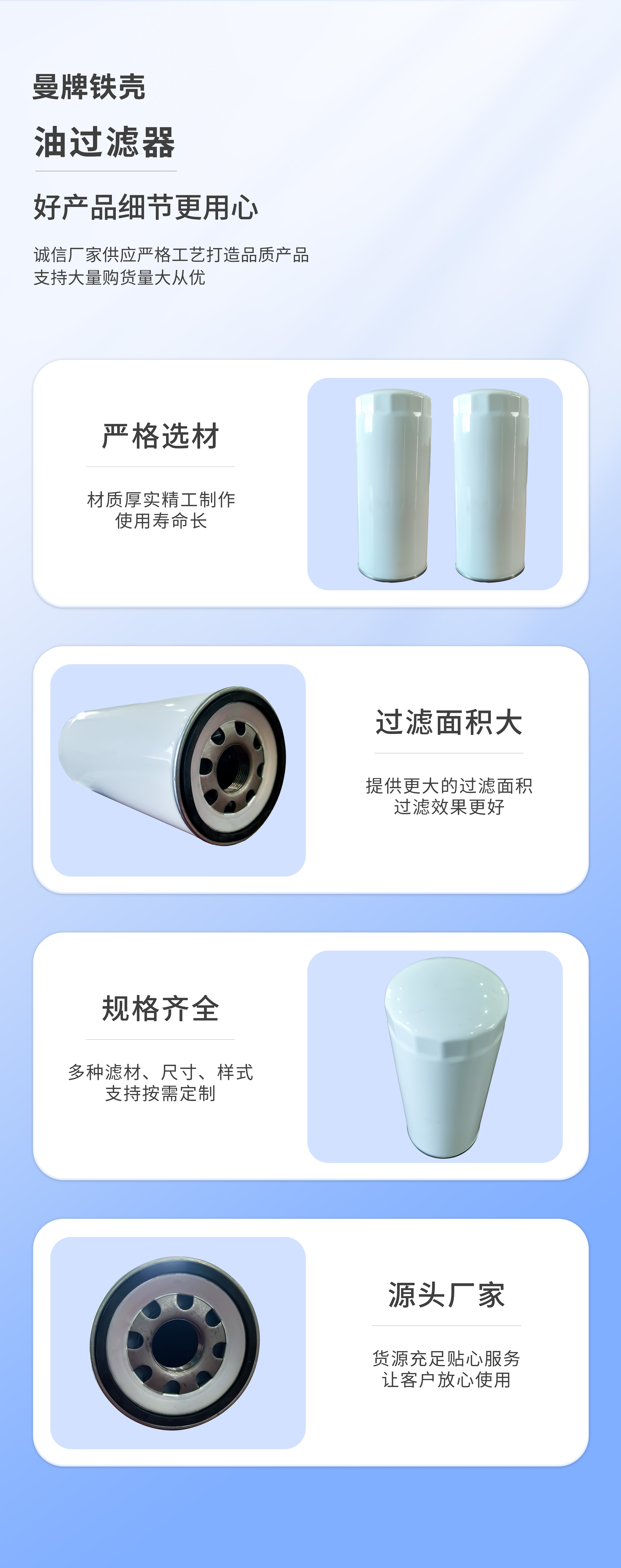 曼牌濾清器廣泛應用在乘用車、商用車、工程機械和工業領域,主要負責清除空氣中的微粒雜質的裝置。其主要作用是濾除將要進入汽缸的空氣中有害雜質,以減少汽缸、活塞、活塞環、氣門及氣門座的早期磨損和氧化。 因為機油在發動機的保護方面承擔著潤滑、冷卻、清潔、防腐和密封等至關重要的作用;而只有清潔的機油才能完成上述工作。所以,機油和機油濾清器的整體性能才是決定機油保護發動機壽命的決定性因素。