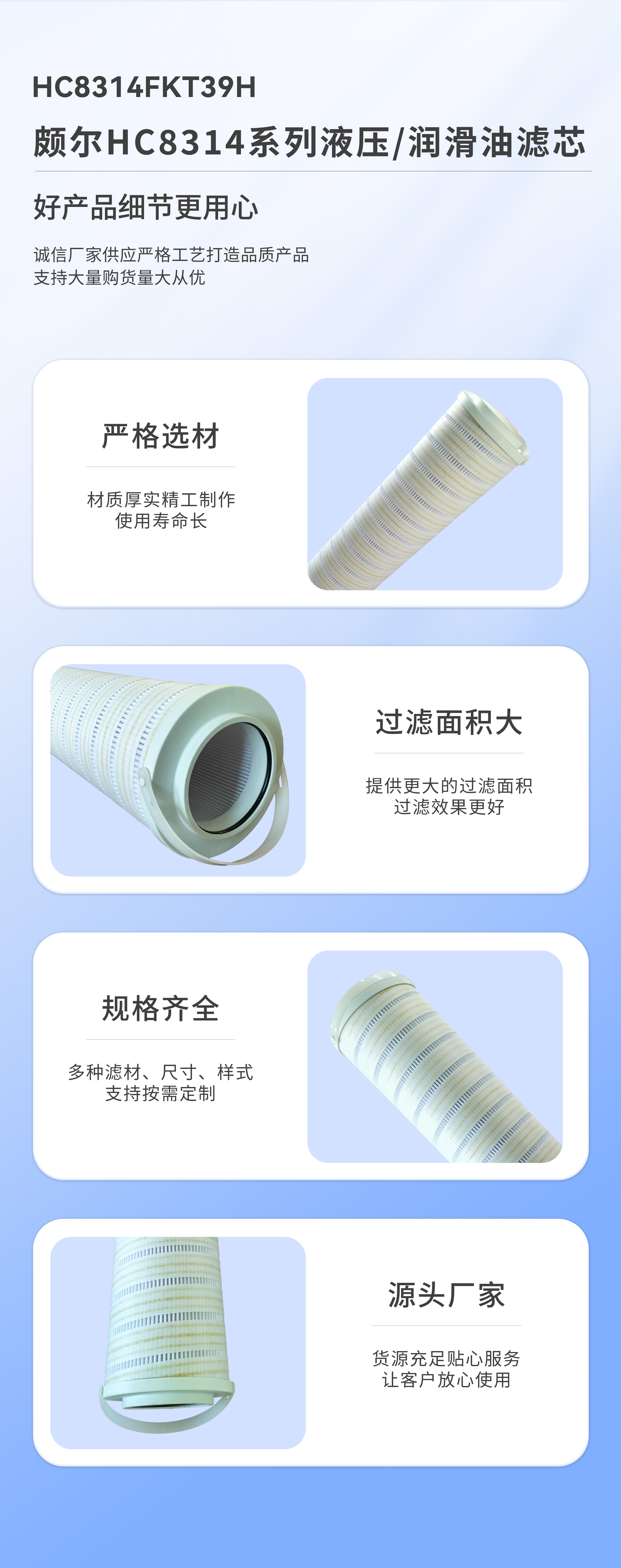1、該濾芯采用進口玻纖制成,具有排污方便、流通面積大、壓力損失小,結構簡單,體積小,重量輕、過濾材質均勻等。