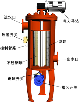 采用機(jī)電一體化設(shè)計。全自動自清洗過濾器由驅(qū)動機(jī)構(gòu)、控制管路(包括壓差開關(guān))、主管組件、濾芯組件、清洗機(jī)構(gòu)、連接法蘭等主要零部件組成。 電控器、控制管路和排污閥構(gòu)成過濾器的控制部分,用于實現(xiàn)自動清洗排污過程。 控制管路由壓差開關(guān)、管接頭、黃銅管等附件組成。過濾器常規(guī)產(chǎn)品使用不銹鋼轉(zhuǎn)刷,也可根據(jù)不同的使用條件(水溫、水質(zhì)),選用其它材質(zhì)的轉(zhuǎn)刷。